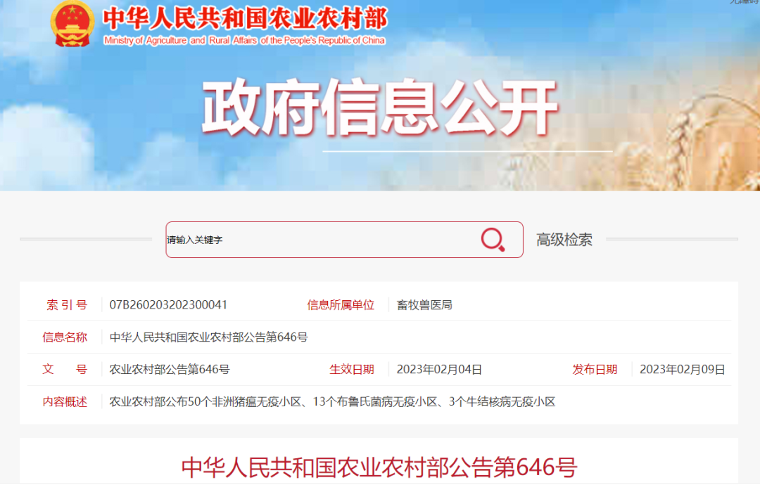 近日,中华人民共和国农业农村部根据《中华人民共和国动物防疫法》《无规定动物疫病小区评估管理办法》及有关规定,下发安徽等19个省份的50个非洲猪瘟无疫小区达到有关疫病无疫标准的公告名单,“上海沁侬牧业科...
